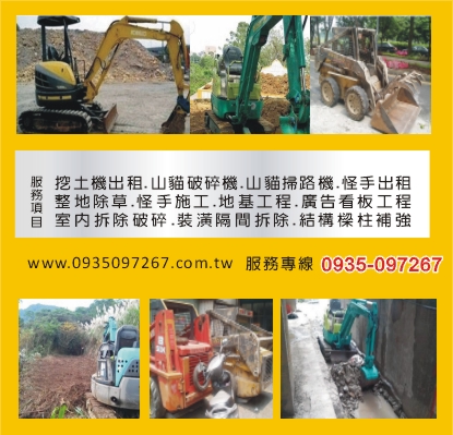 挖土機出租、山貓破碎機、山貓掃路機、整地除草、怪手施工、地基工程、廣告看板工程、室內拆除破碎、裝潢隔間拆除、結構樑柱補強、怪手出租、小乖乖挖土機出租、台北挖土機出租、小型挖土機怪手、1米迷你挖土機怪手、小乖乖鏟土機、鏟裝機夾子拆除、怪手夾子拆除、怪手拆除、挖土機夾子拆除、掃路機出租、鏟裝機夾子拆除、爪子拆除清運、園藝景觀種樹、移樹、水電信管溝、排水管、污水管化糞池埋管、廣告看板基礎、排水溝工程、電梯井工程昇降機、地基地樑基礎工程、鐵皮屋基礎基座工程、廣告看板基礎基座工程、百貨公司拆除、專業施工整地、園藝、鋪柏油、水電埋管路、瀧才工程